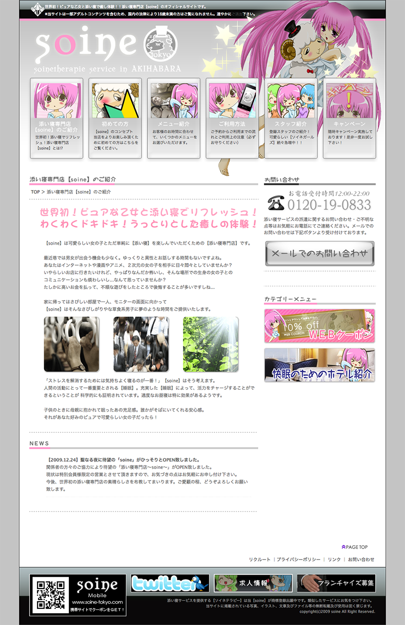 非風俗の添い寝店のサイトです。 各所に萌え系キャラクターのイラストを使いコンセプ[...]